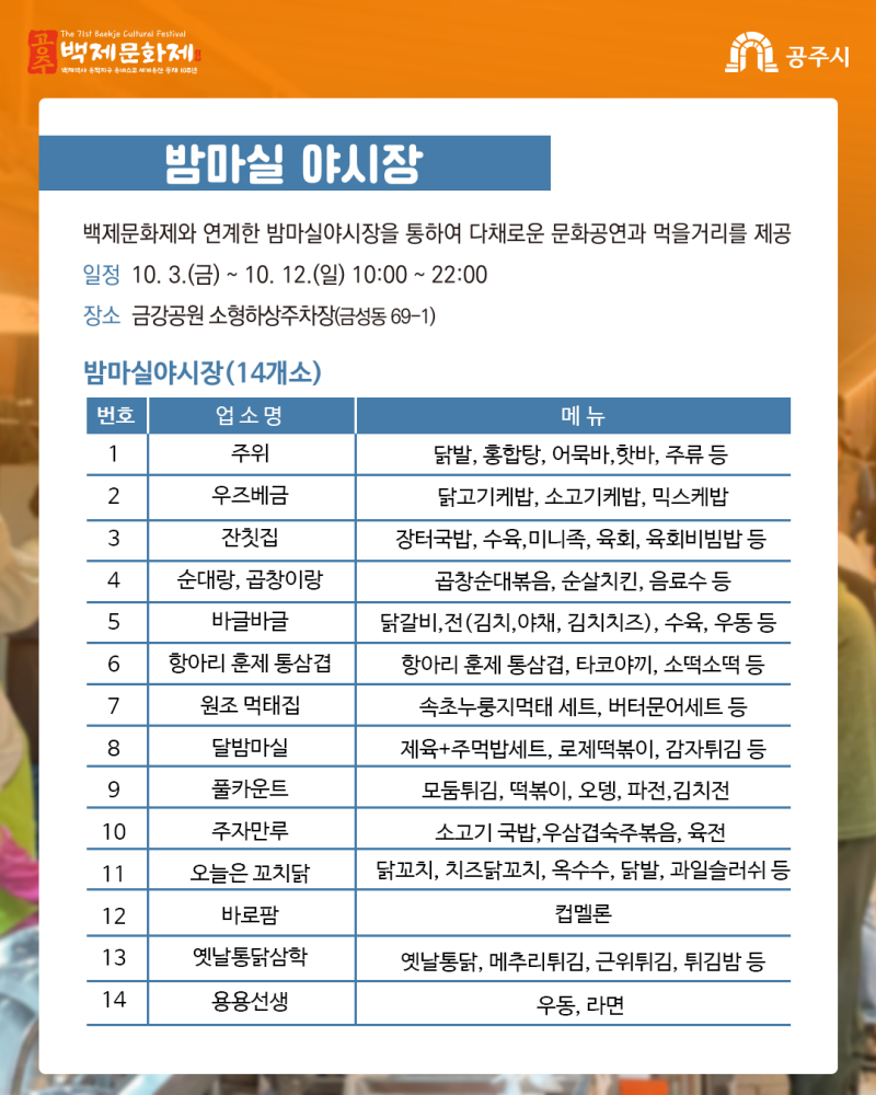 백제문화제와 연계한 밤마실야시장을 통하여 다채로운 문화공연과 먹을거리를 제공